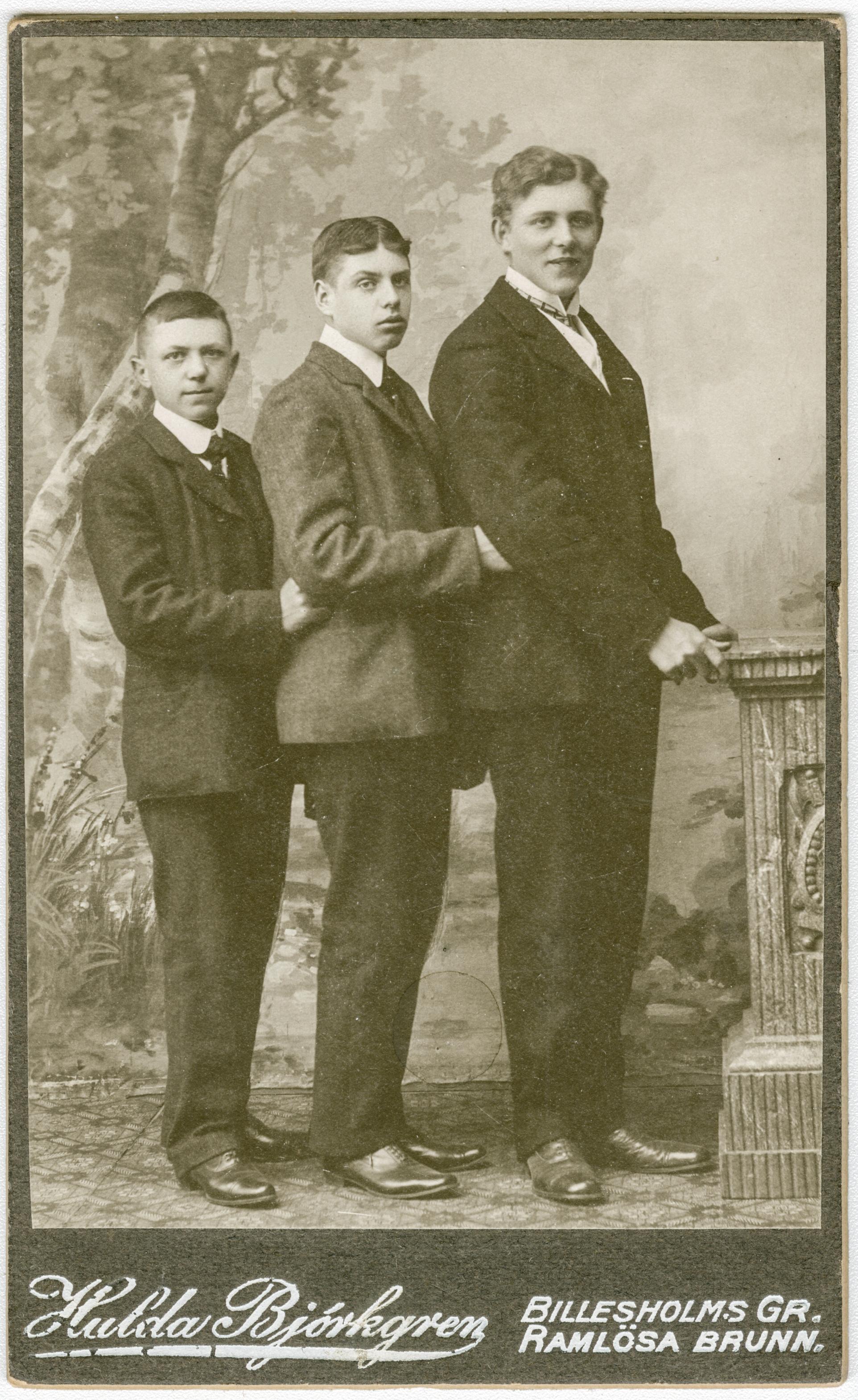 Tre män i helfigur i en ateljé - Sven Klemming och två okända. Visitkort.