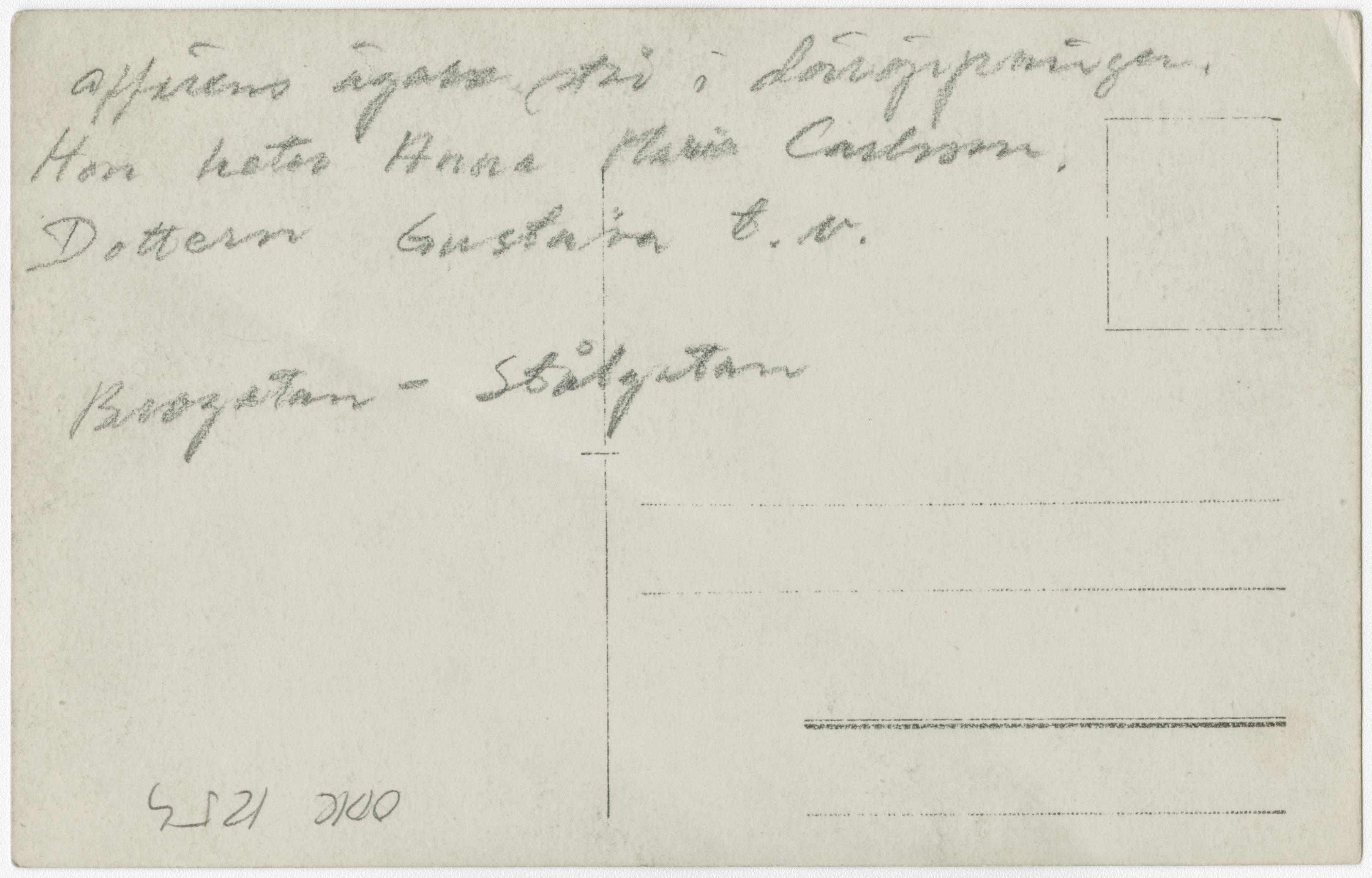 Påskriften lyder: "Affärens ägare står i dörröppningen. Hon heter Anna Maria Carlsson. Dottern Gustava t.v. Brogatan - Stålgatan".