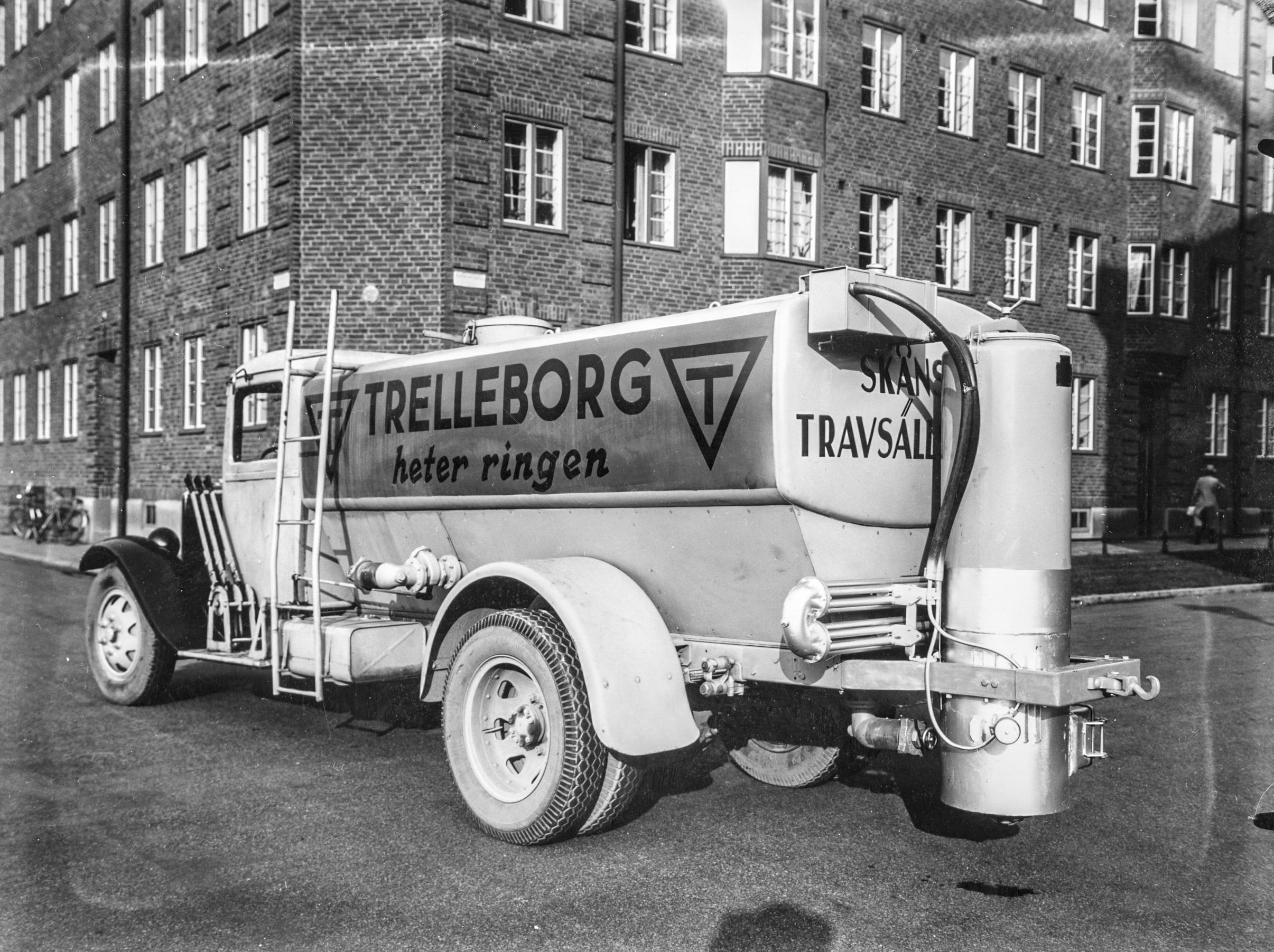 - Gatubild - En tankbil med reklam för Trelleborgs gummi. Gengasaggregat där bak. Förmodligen tillhör ekipaget Skånska Travsällskapet. Bilen står på hörnet av Fredmansgatan och Bellmansgatan i Malmö. Förmodligen från början av 1940-talet.