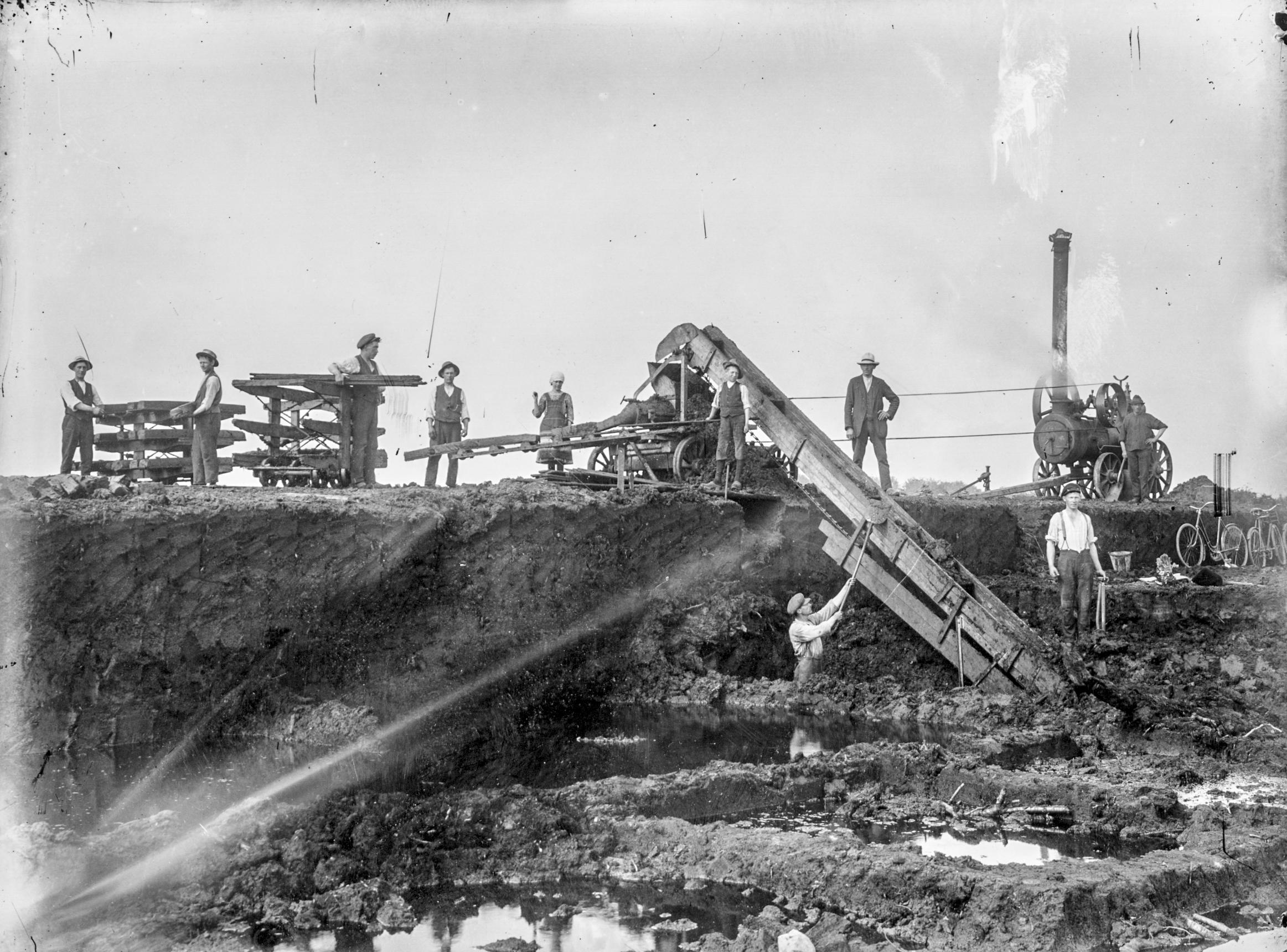 torvbrytning; torvarbetare; jordbruksmaskin; paternosterverk; lokomobil; spade; man; utgrävning; män; cyklar