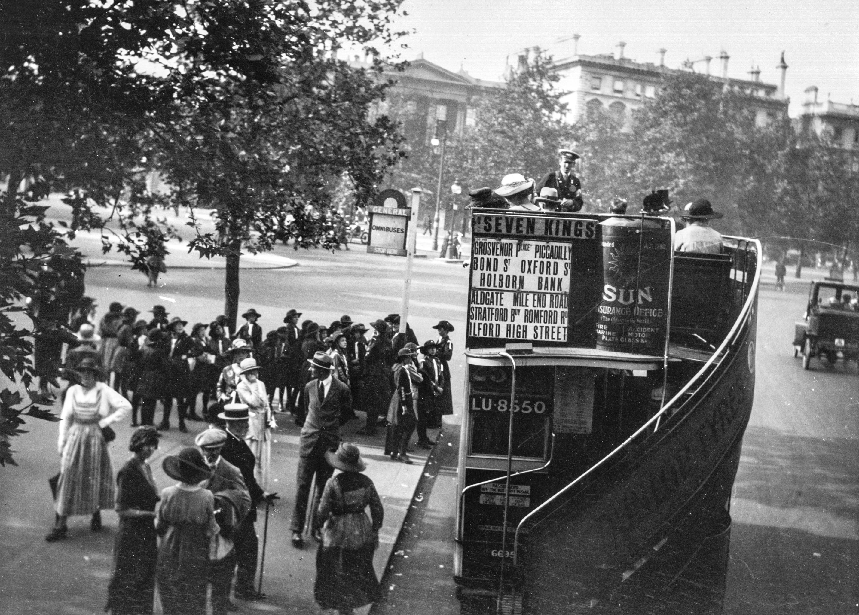 Gatubild - turistbuss - London. En buss bakifrån vid en busshållplats.