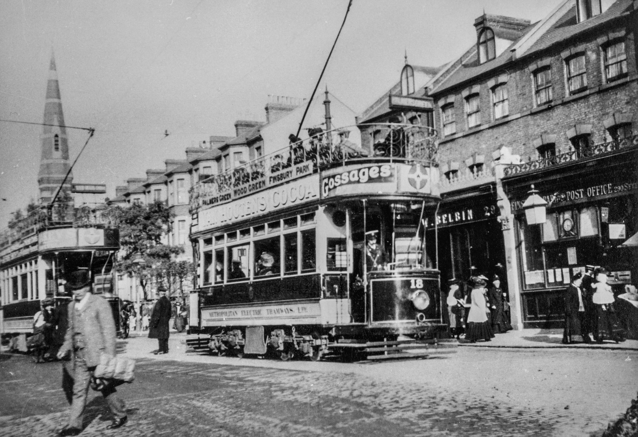 Gatubild med spårvagnar från London. I närheten av Finsbury Park.