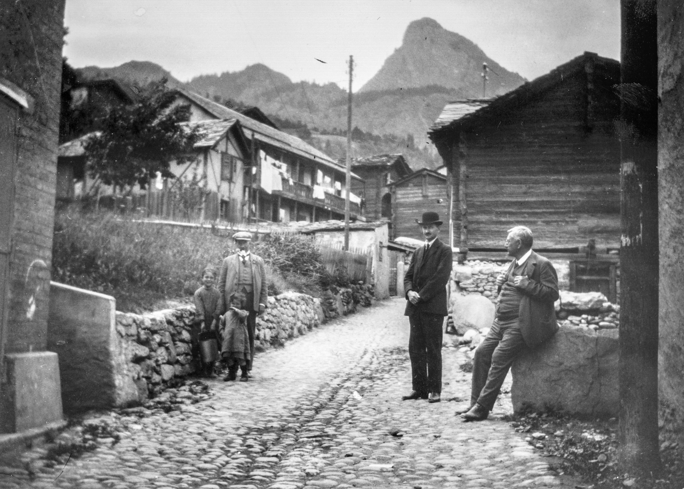 Tre män och två barn på en bygata i Naters, Schweiz.