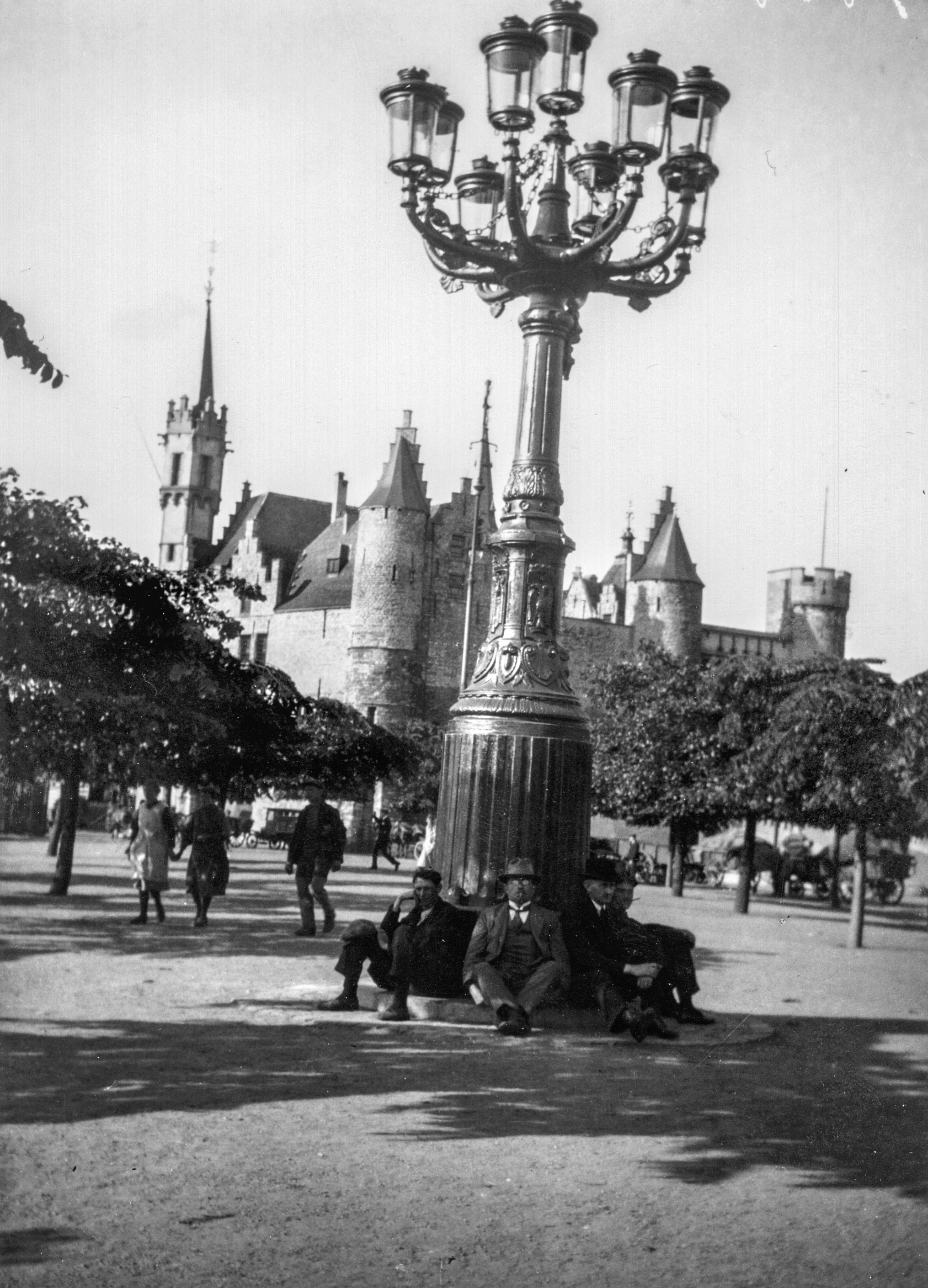 Gatubild - Fyra män vid en stor lyktstolpe framför slottet Het Steen i Antwerpen.