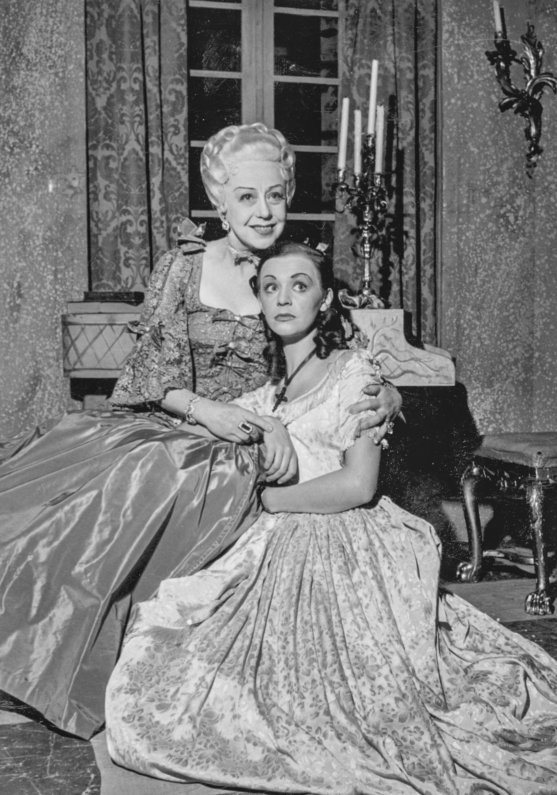 Två skådespelerskor - Elsa Carlsson och Gun Arvidsson i "Markisinnan". Från Studio Aarni i Eskilstuna.