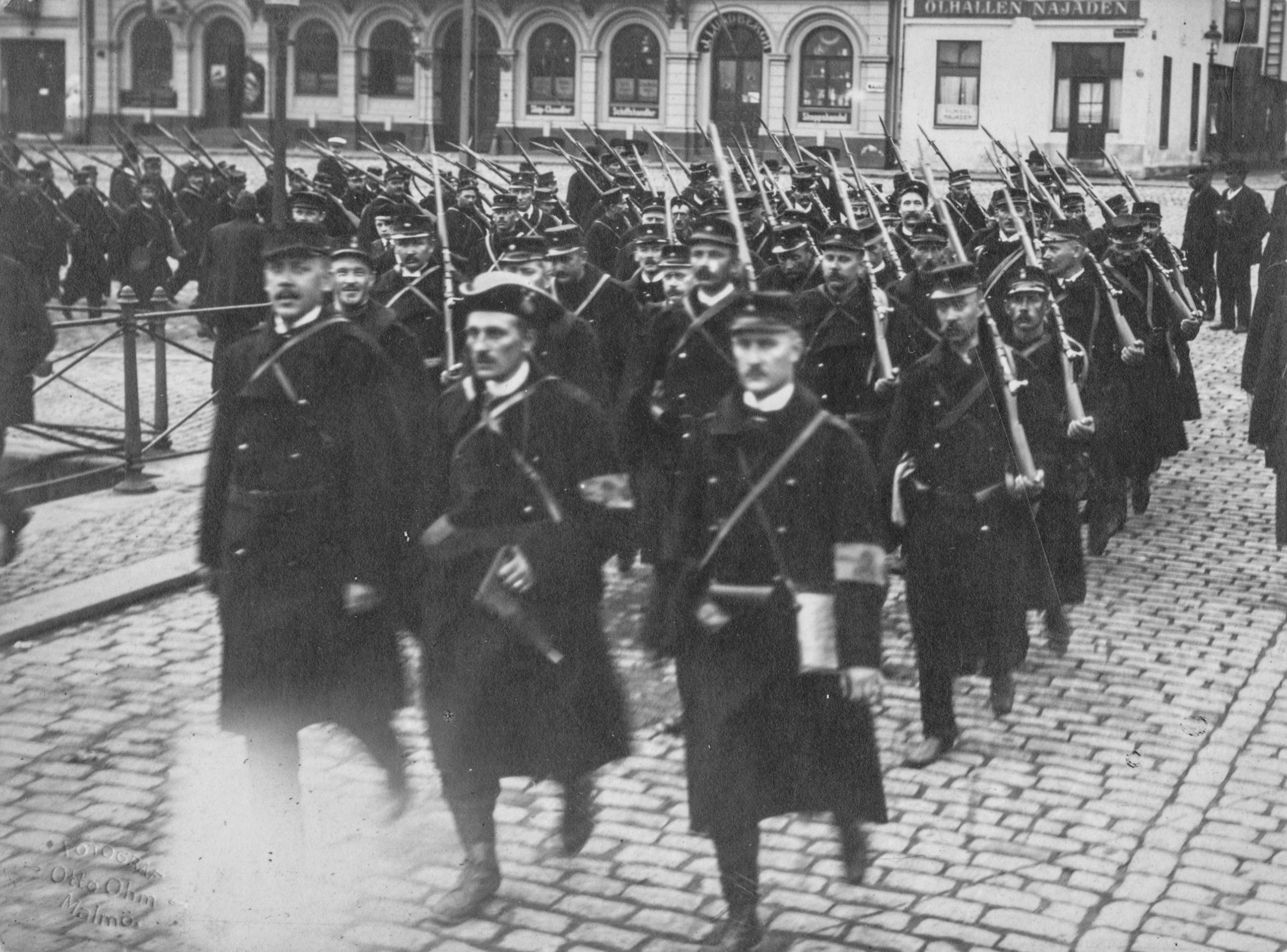 - Soldater (sannolikt ur Landstormen) på marsch, viker av från Norra Vallgatan och ska strax passera Hjälmarbron i Malmö. I bakgrunden ser man ölhallen Najaden på hörnet av Norra Vallgatan och Mäster Johansgatan i kvarteret Jörgen Kock, till vänster därom Beijerska huset med bland annat J Lundberghs skeppshandel.