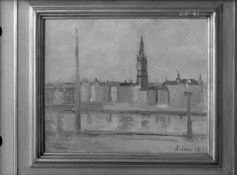 Stadsbild, flod, kanal - olja, sign. Palme 34. (Stockholm ?).