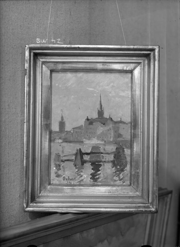 Stadsbild, flod, kanal - olja, sign. Palme 34. (Stockholm ?).