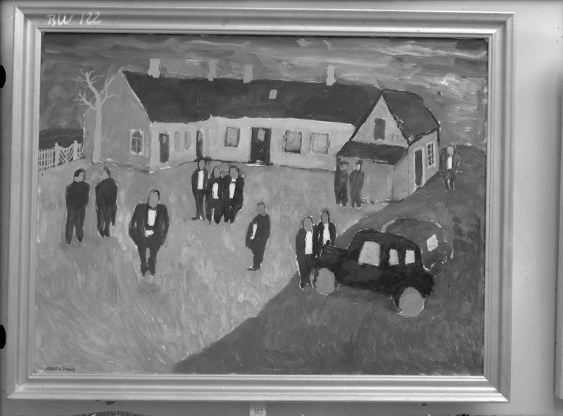 Människor och bilar, bondgård - olja, sign. Martin Emond.