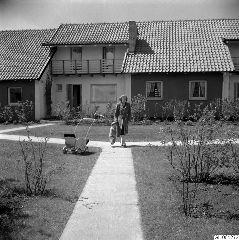 Radhus i Friluftsstaden, kvinna med en liten pojke, barnvagn.