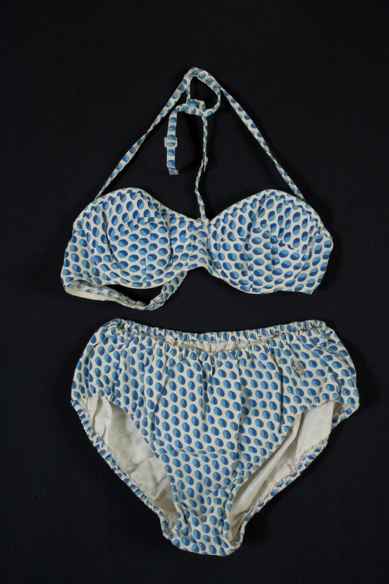 - Bikini sydd av ett tyg med vit botten med prickar i två olika blå nyanser. Byxa och behå. Foder av vitt bomullstyg. Byxorna har resår i midja och byxben. Påsytt märke av krona i vitmetall (Triumphs). Behån har inlägg av skumgummi och skena i kuporna. Påsydda smala hängsleband av tyget med metallspänne att fästa i isydda hankar bak. Behån knäpps med spänne i ryggen. Isydd resår i ena sidan. Etikett med sliten text: "Triumph International KORRY 1 40 Made in Austria Size 34.