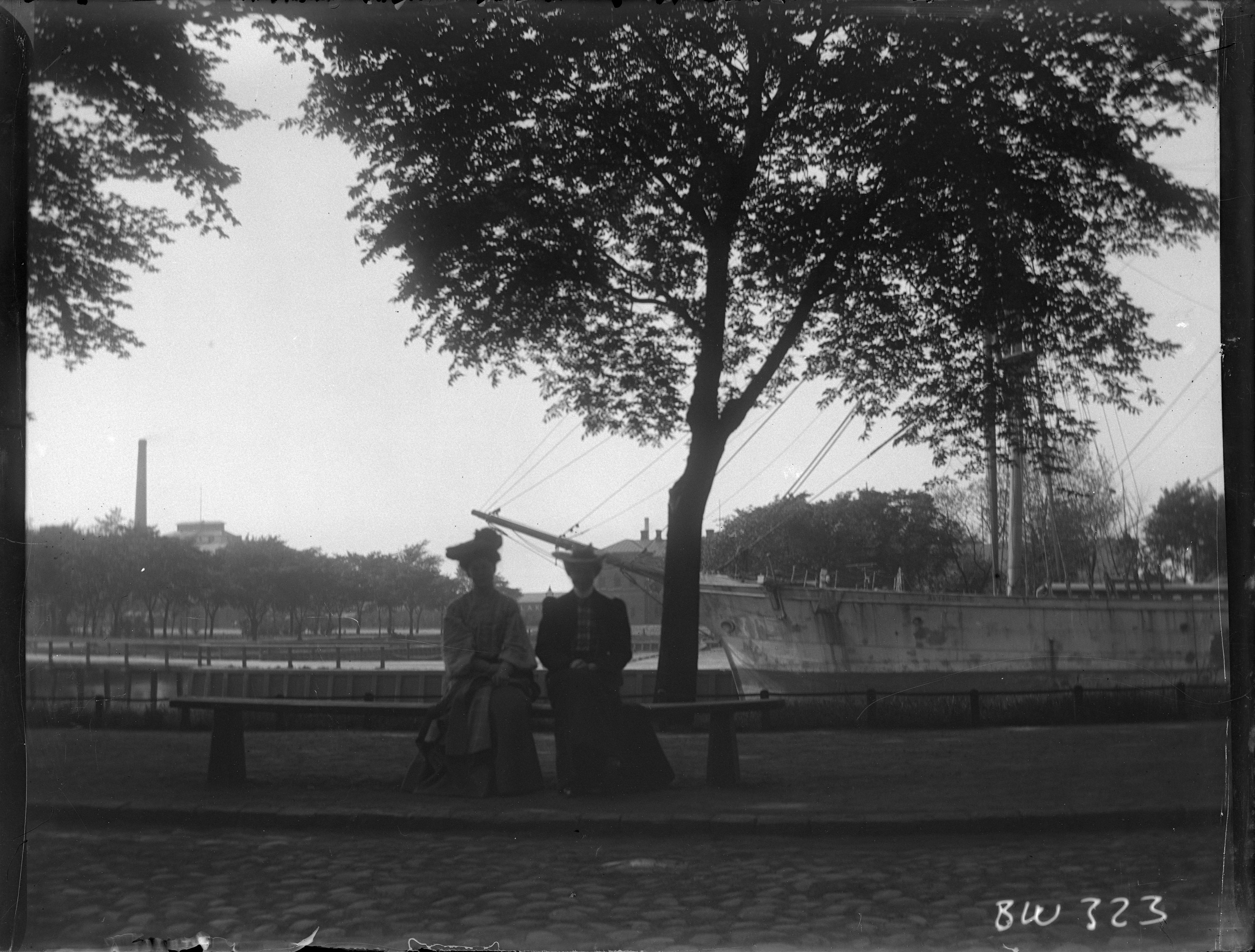 2 kvinnor på parkbänken vid kanal, segelbåt.