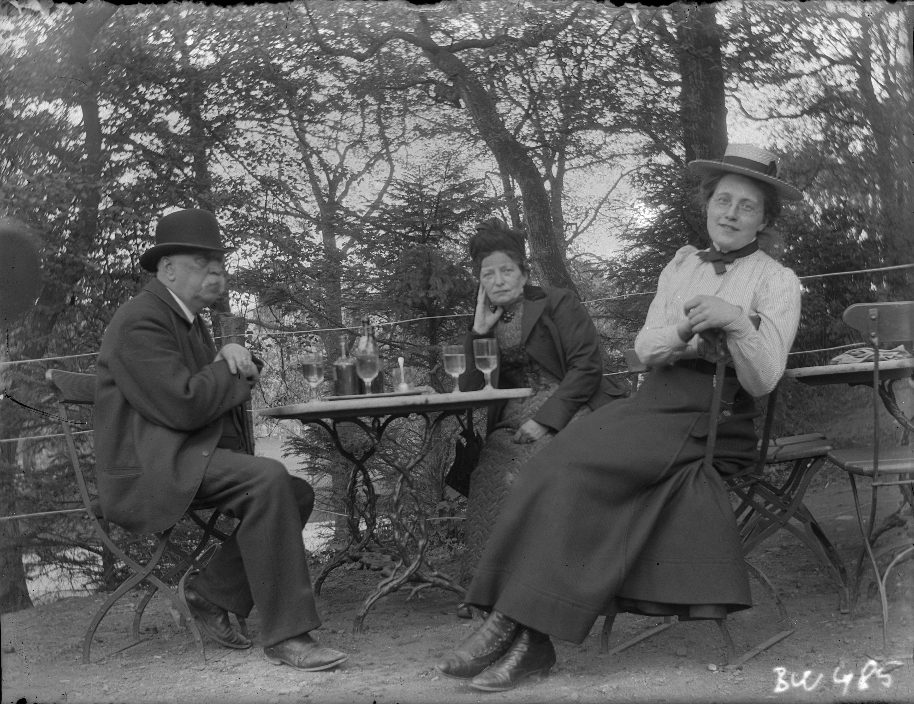 Man och två kvinnor vid bord, ext. "Familjen Norrlander i Slottskogen".
