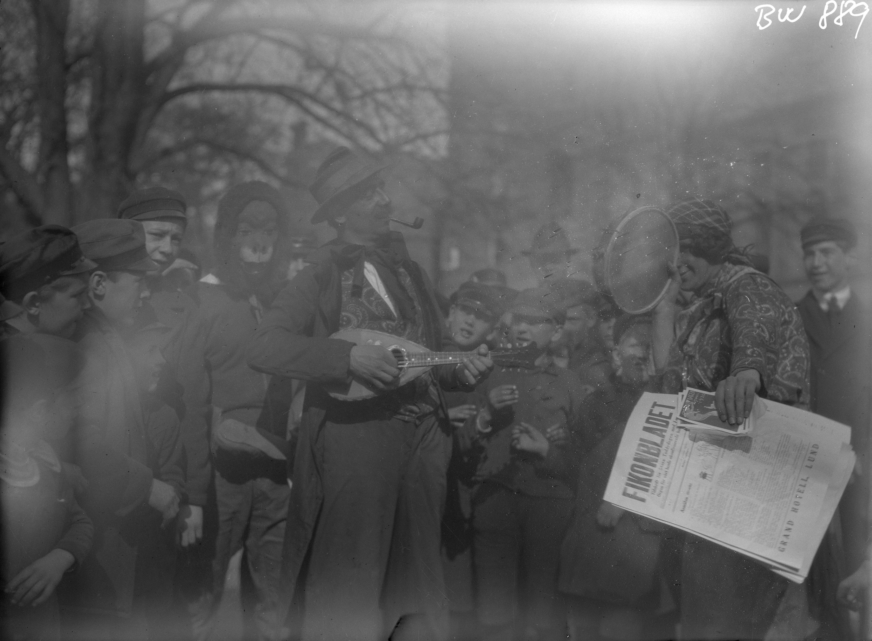 Gatubild - studenter, maskeradklädda - Toddydagen, Lund (tidningen "Fikonbladet").