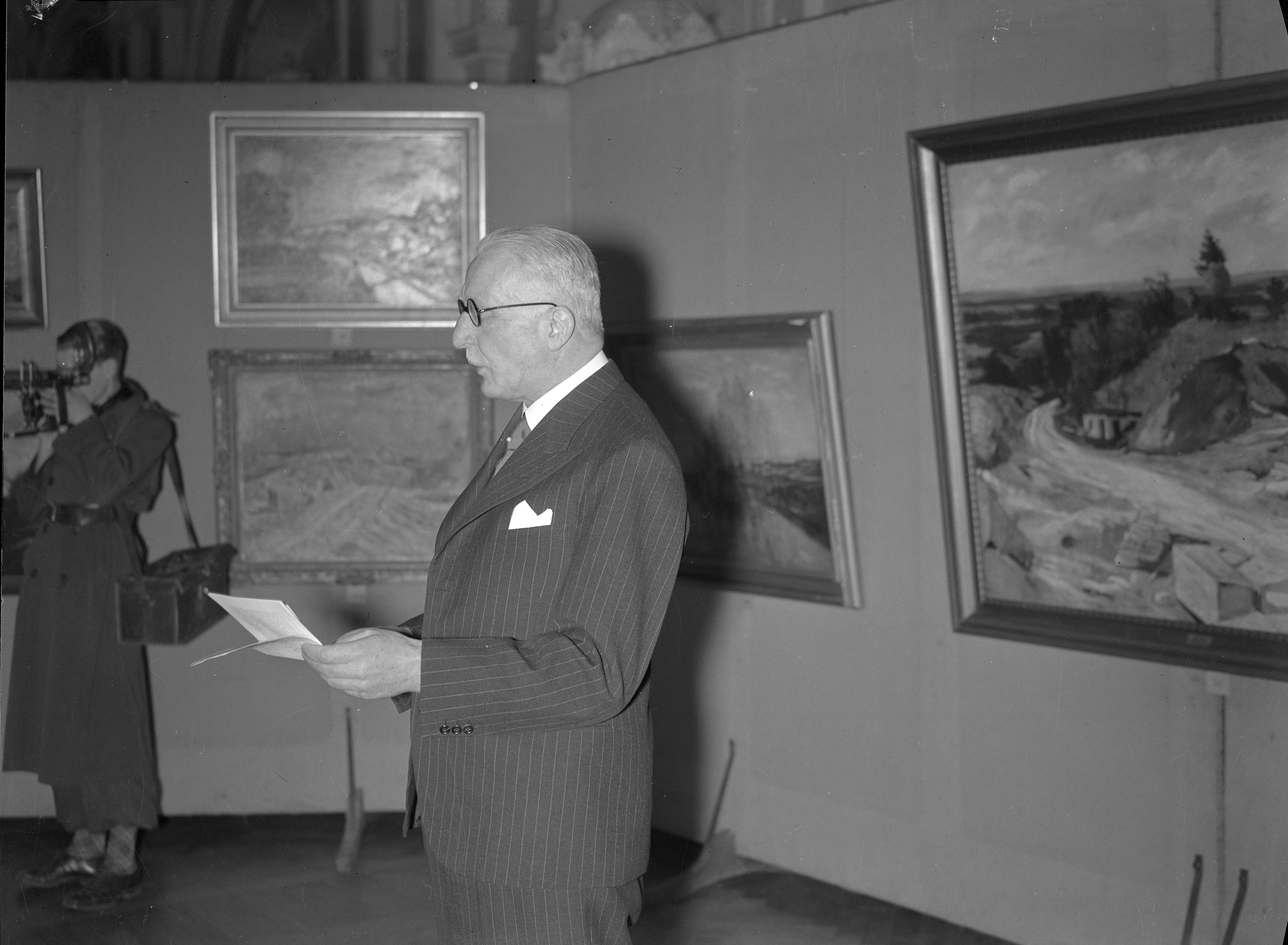 Man med tavlor - int. utställningslokal (fotograf i bakgrunden).