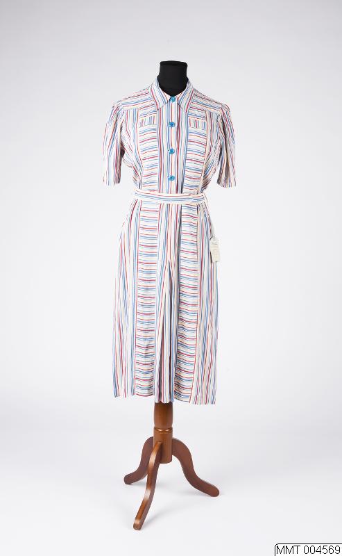 Klänning av konstsilke, med randmönster i vitt, gult, rött och blått med dekorisättningar av tyget på annan ledd på axlar och på vardera sidan av knäppningen framtill. Avskuren i midjan. Kort isydd ärm. Isydd nedliggande krage. Knäppning fram med 4 blå knappar. Rak kjol i två våder, nedsytt veck mitt fram. Knytskärp av tyget.