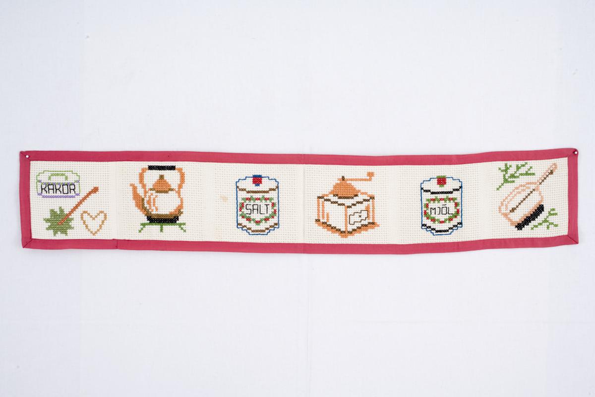 - Vit grov aidaväv, i bomull och linne(?) avdelad i rutor, 13x13,5 cm, genom ett fält med kypertvävning. Broderi i orange, brunt, svart, grönt, rött, lila, blått. 1 figur i varje ruta, endast konturerna sydda, ej fyllda. Kakburk, kaffekittel, saltkrus, kaffekvarn, mjölkruka, kastrull. Runtom ett rosarött bomullsband påsytt med maskin, 1,5 cm brett.