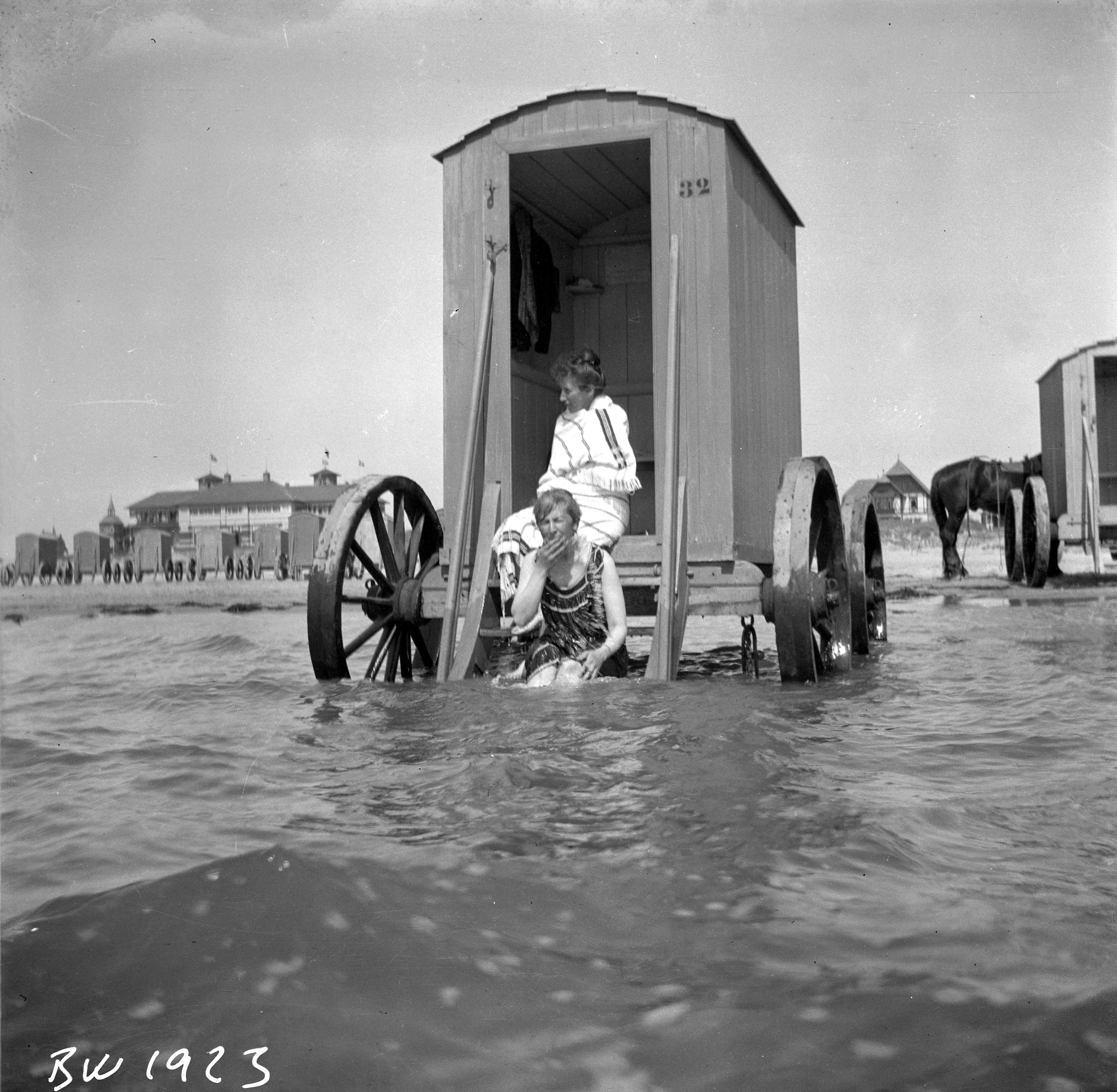 Strandbild - hytt på vagnunderrede i vattnet, 2 kvinnor badar.