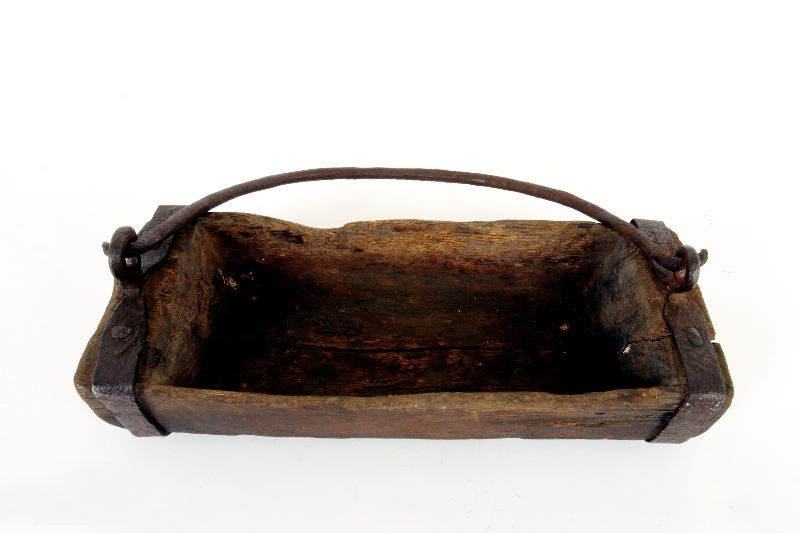 Verktygslåda för hovslagare. Urholkat, rektangulärt trätråg med runtomgående bandjärnsbeslag i bägge ändar, i vilka är fäst ett bågformigt handtag av rundjärn.
