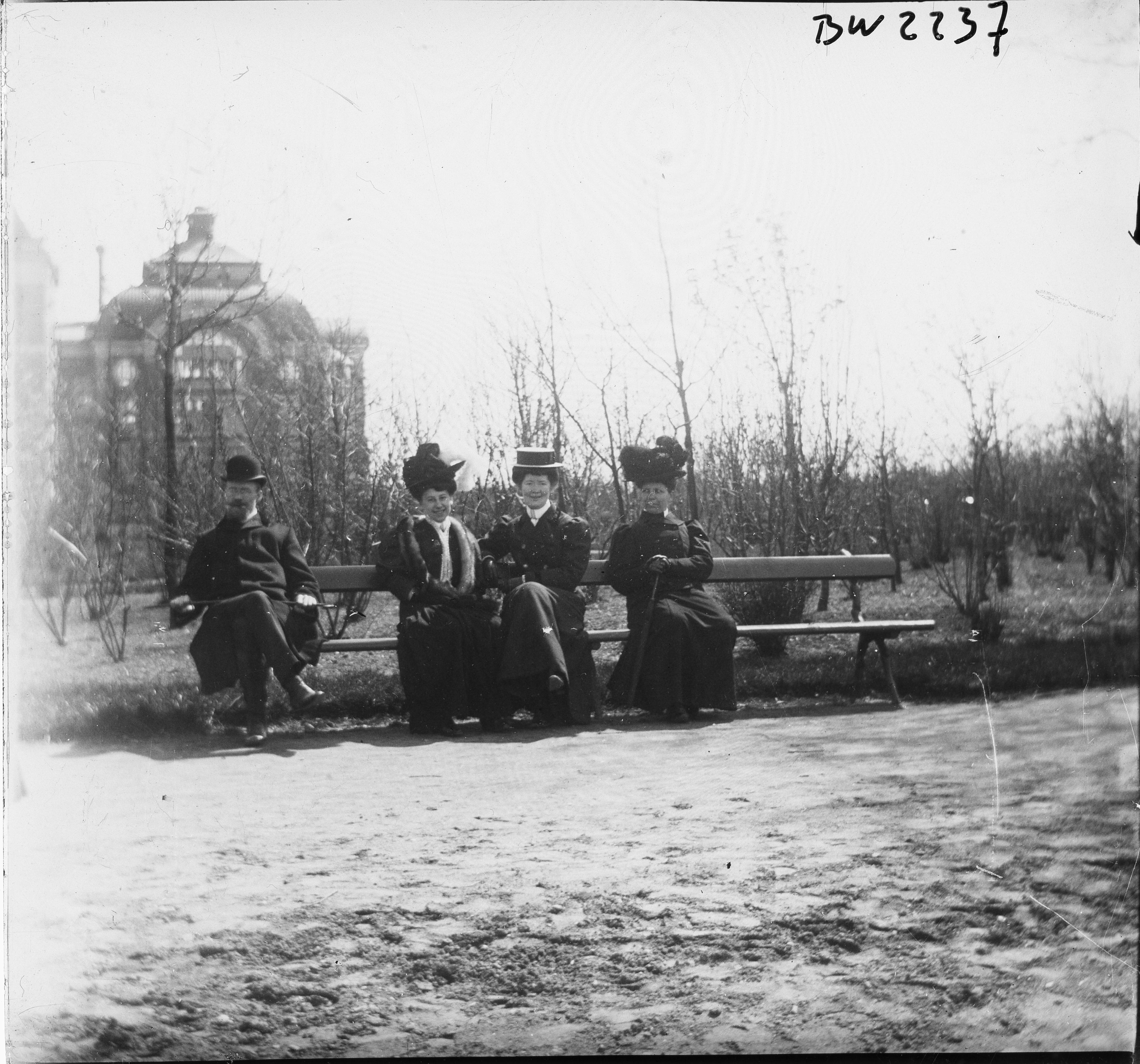 - Man och tre kvinnor på parkbänk i SLottsparken. I bakgrunden syns Petriskolan (då Realskolan).