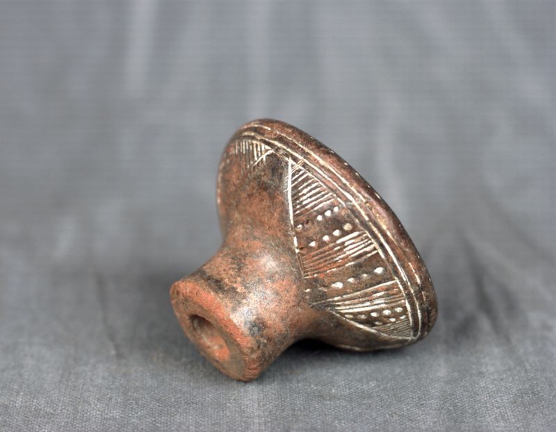 Sländtrissa av ljust rödbrunt lergods, konformig med cylindrisk topp,