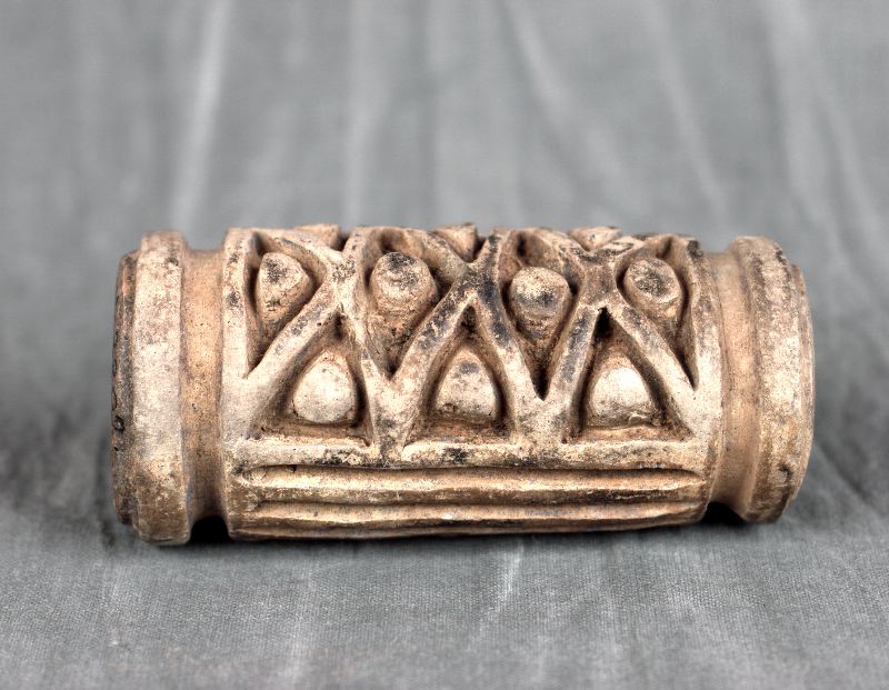 Cylindrisk tryckstock av bränd lera, ihålig. Två inristade mönsterfält