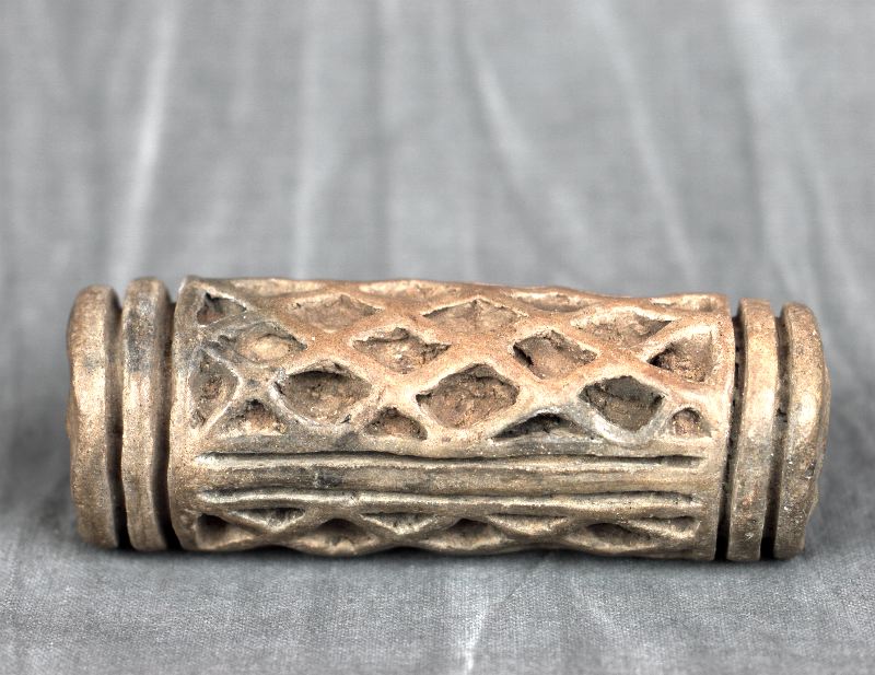 Cylindrisk tryckstock av bränd lera. Två fält med inristade rombmönster