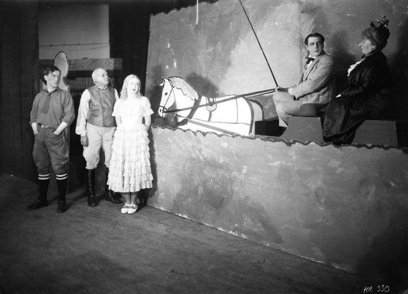 Skådespelare i "hästregn". Ur teaterpjäs "Hans nåds testamente".