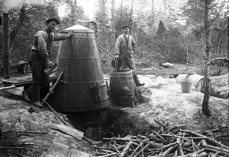 2 män vid apparat för tjärframställning, skog.