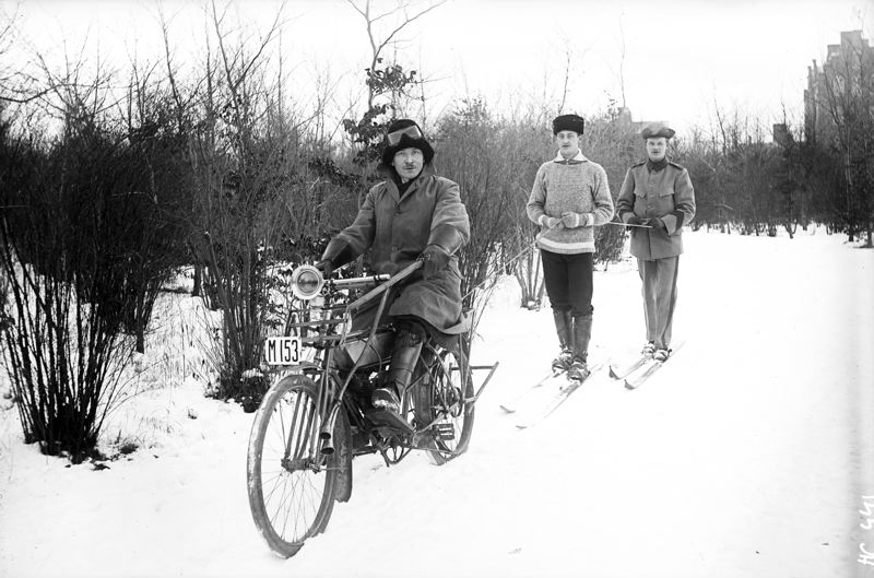 Man på motorgykel (M 153), dragande 2 skidåkare.