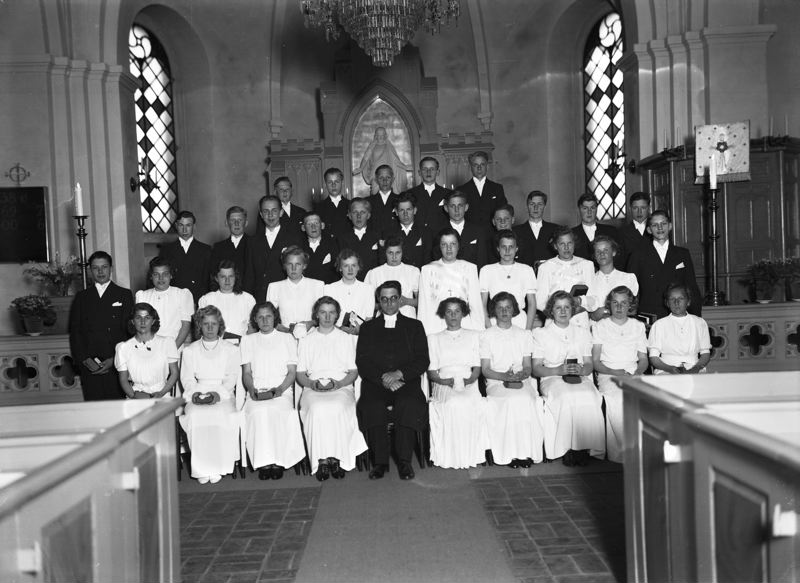 Kyrkointeriör - konfirmander framför altaret - Husie