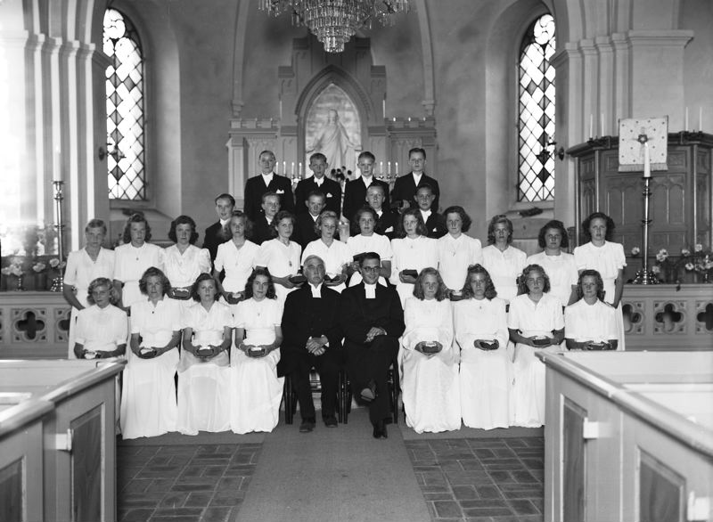 Kyrkointeriör - konfirmander framför altaret - Husie