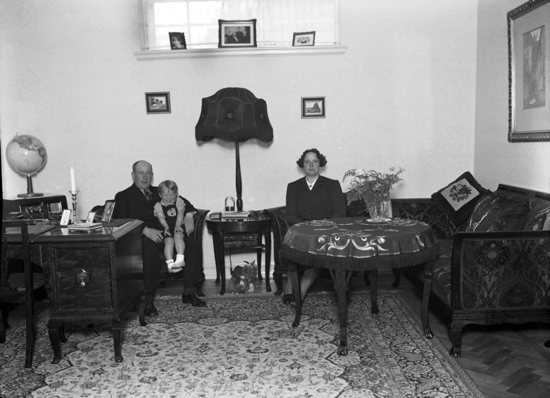 Gustav Nilsson - rumsinteriör, par med liten pojke, fåtölj, skrivbord.