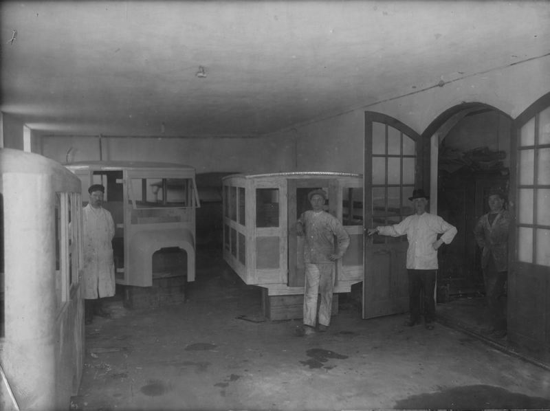 Int. - 4 män vid halvfärdiga lastbilkarosser.