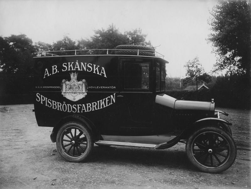 Skåpbil på landsväg, "H.K.H. Kronprinsens Hovleverantör", "AB Skånska Spisbrödsfabriken", Ford ?