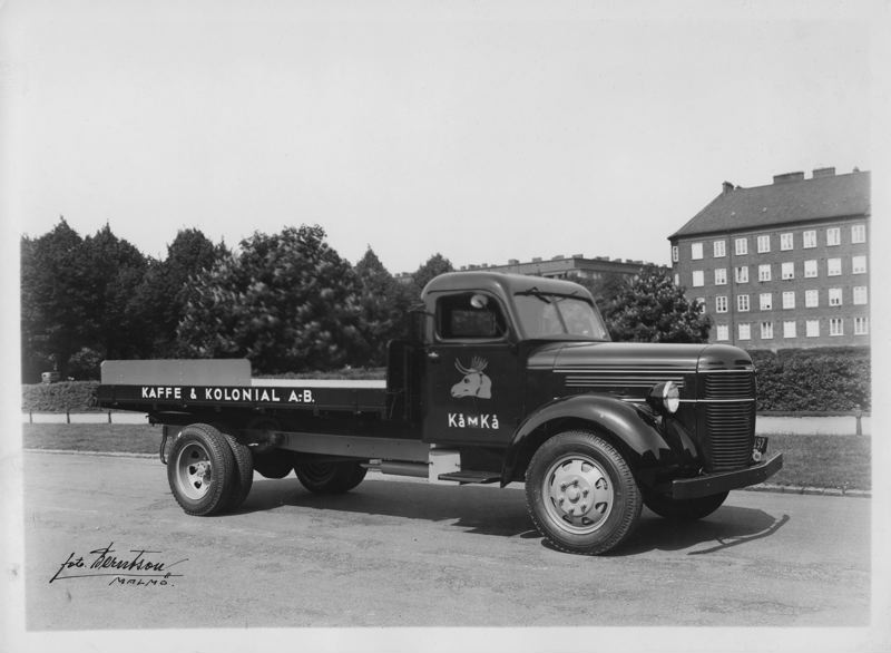 Lastbil på gatan "Kaffe & Kolonial AB", Volvo. Signerat: Foto Berntson, Malmö
