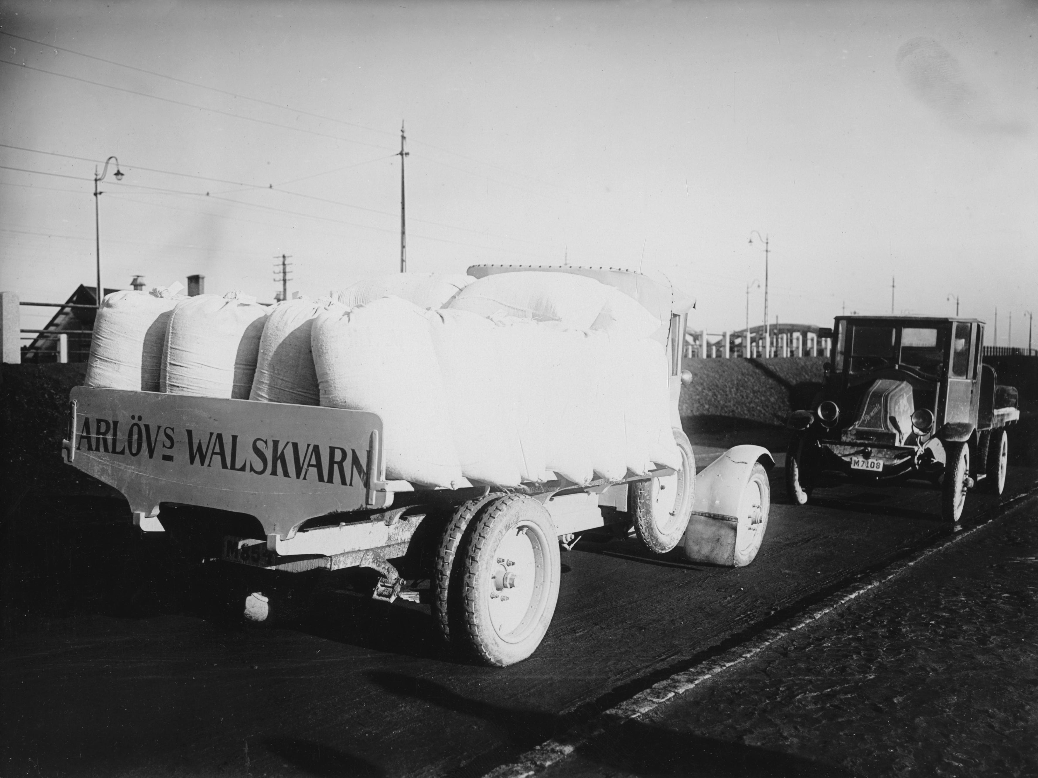 M7108 var mycket riktigt en 1924-års Renault lastbil. Den ägdes initialt av Trelleborgs Ångkvarn mfl Industriers AB och övertogs 1930 av AB Malmö Stora Valskvarn. Men registreringsnumret M854 kan jag inte se på den andra bilen var det står "Arlövs Walskvarn". Jag tror att även detta är en Renault från runt 1925 eller 1926-27. Det fanns sex stycken Renault lastbilar som vid tiden var stationerade i Arlöv, men ingen ägdes av Arlövs Valskvarn. En annan Renault lastbil ägdes av Malmö Stora Walskvarn. Men Arlövs Walskvarn ägde en 1919-års Opel (skrotad sent 1925), men det är absolut ingen Opel på bilden. 1937 inköptes en Volvo lastbil, men det är heller ingen Volvo. Det hade varit intressant om man kunde urskilja registreringsnumret på den ljusa lastbilen.