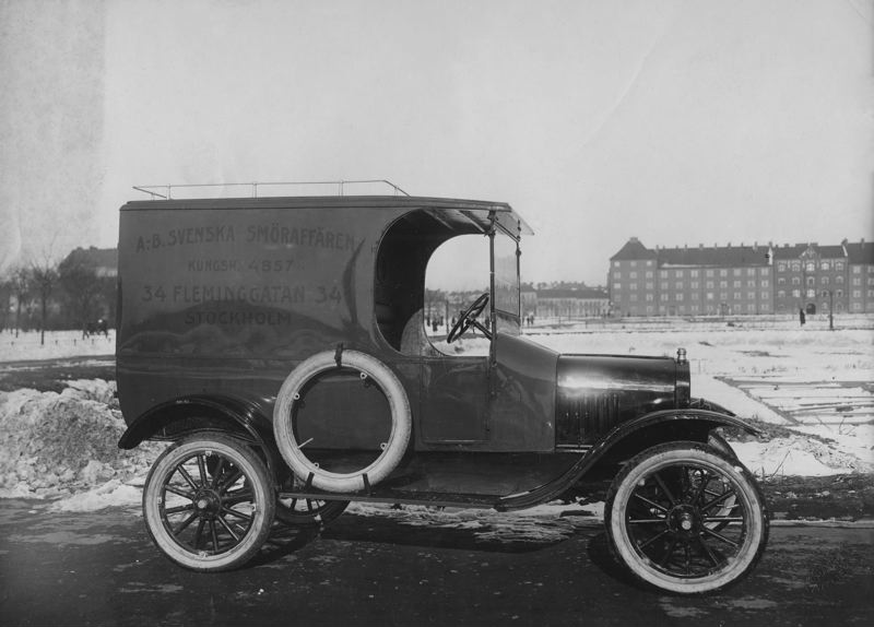 Skåpbil på gatan, vinter. Ford "AB Svenska Smöraffären, Flemminggatan 34, Stockholm"