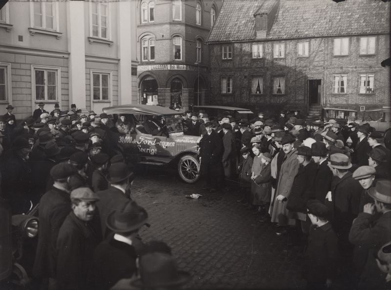 Den 30.00de Ford på ett torg, stor publik.