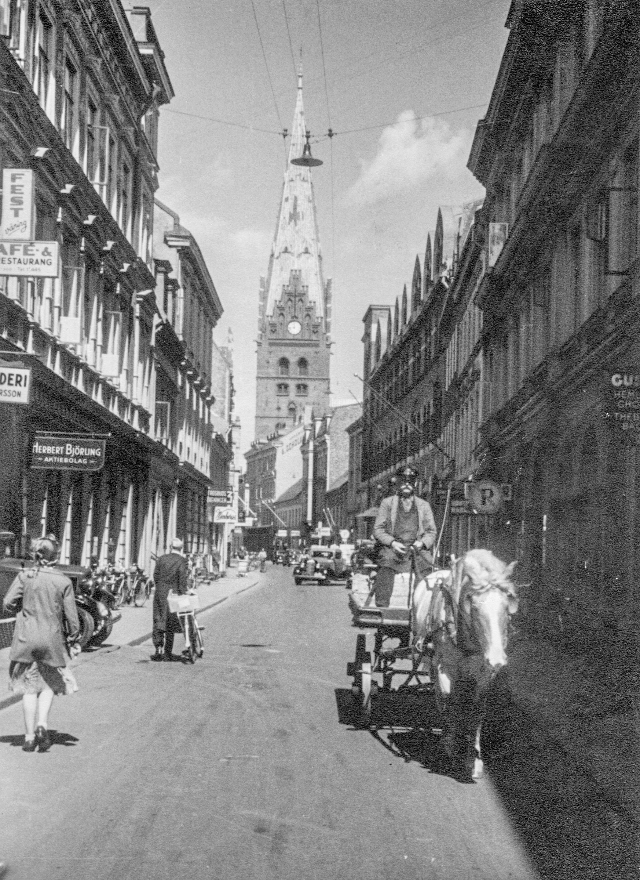 Kalendegatan i riktning norrut mot S:t Petri kyrka. Möjligen på 1940- eller 1950-talet.