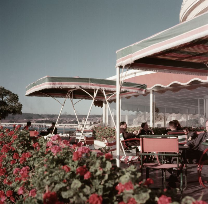 Gäster på en uteservering. Bord och stolar placerade under markiser, omgivna av rabatter med blommande pelargoner.