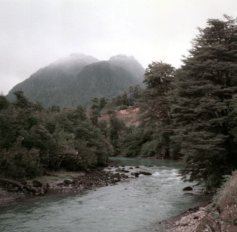 Naturområde med forsande flod, skogbevuxna berg och en rasbrant ner mot floden.