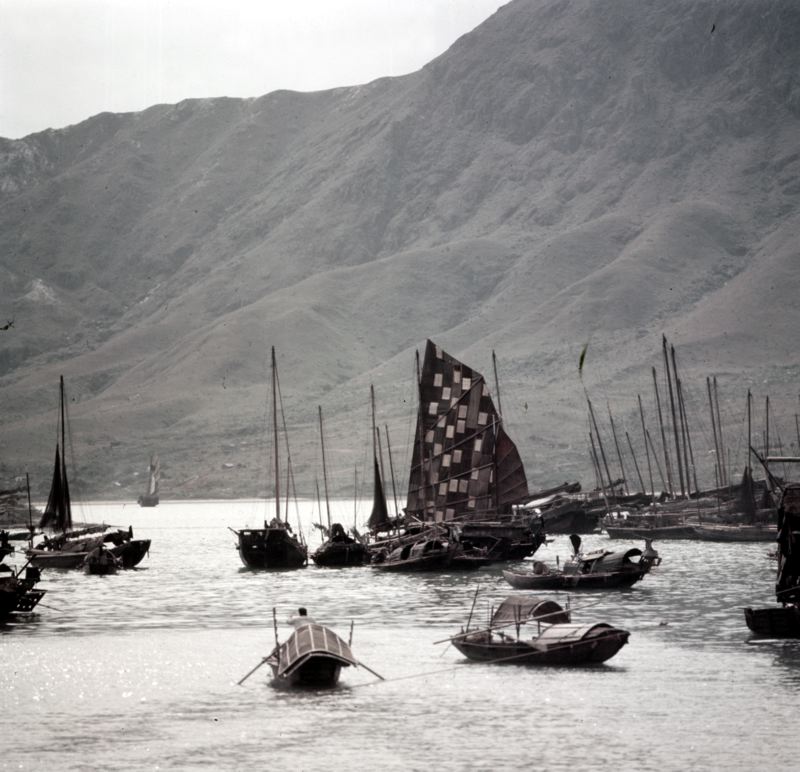 Sampaner för ankar i bukt vid foten av berg i närheten av Hongkong.