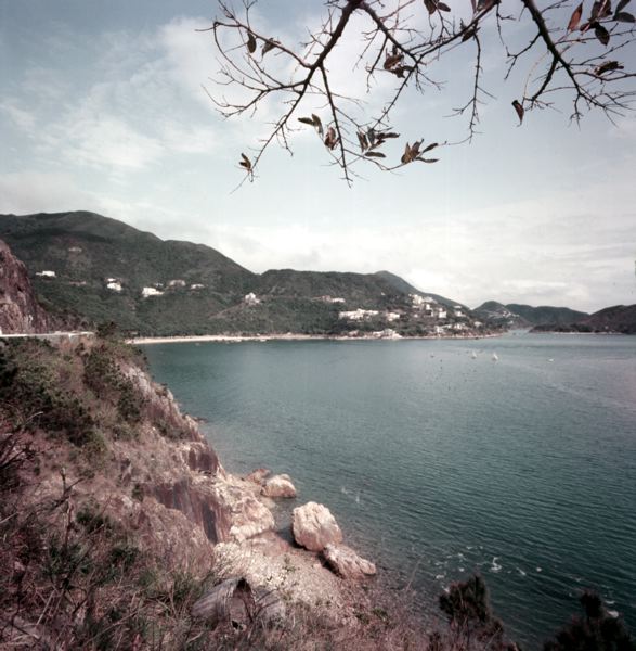 Vy över kustområde med berg, hav och strandområde, bebyggelse sträcker sig upp längs bergssidorna.