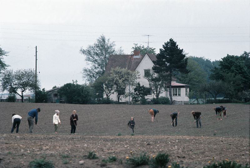 Skånskt lantbruk, med tio personer som gallrar betor på fältet framför huset. I bakgrunden syns havet.