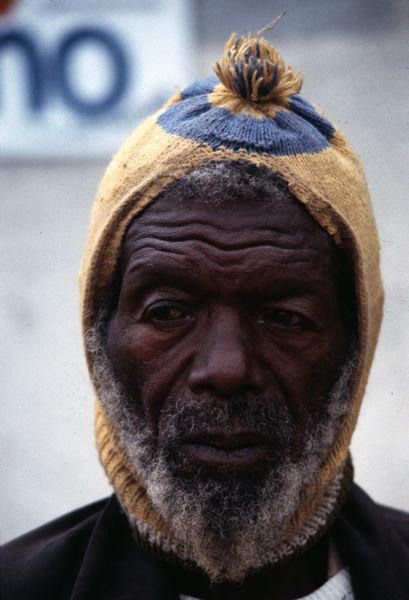 Äldre man med skägg iklädd gul stickad huvudbonad med mönster i blått och tofs.