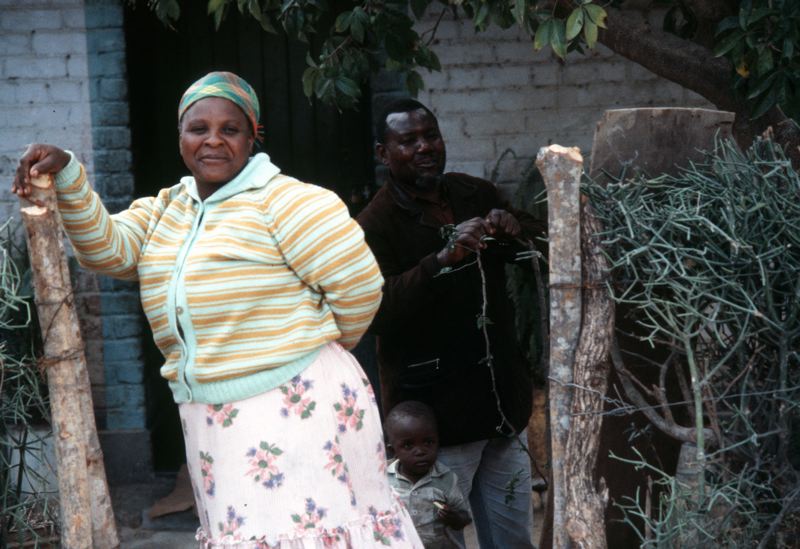 Man, kvinna och ett barn står vid grinden in till målat tegelhus.