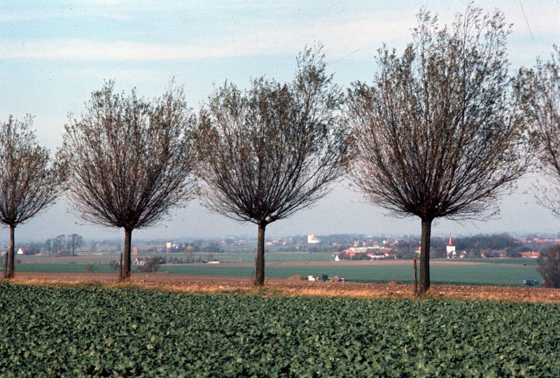 Skånskt landskap med pilträdsallé, åkrar och bybebyggelse.