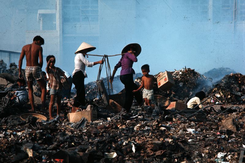 Brandskadat avfall eventuellt efter bombning. Bland annat metallskrot. Två kvinnor, en man och tre barn letar bland avfallet.