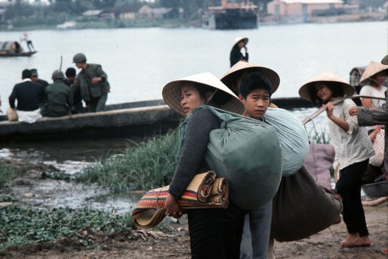 Flyktingar med packning går längs vattendrag, båt med soldater ligger vid strandkanten.
